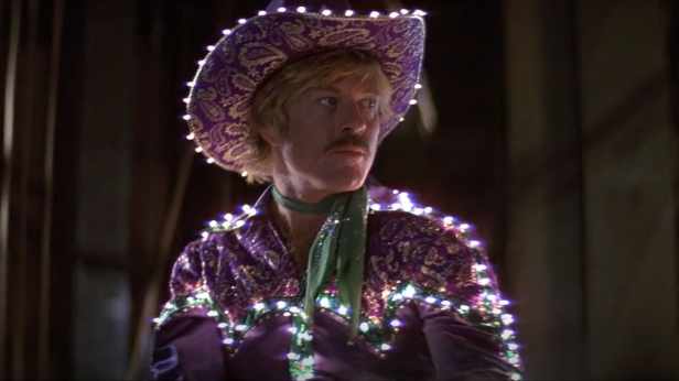 Continuing my investigations into Contemporary and/or ‘twilight’ Westerns, I remembered this Sydney Pollack film from 1979 which I saw on release in the UK in 1980, at the Elephant and Castle ABC. What I had remembered mostly when I watched it again recently was the use of Willie Nelson’s songs. I did remember images of Robert Redford in a sequinned rodeo outfit riding his horse along freeways and over mountains. But that’s about all. I think I must be mellowing in my old age because I’m sure I enjoyed the film more the second time around, even though its flaws and conceits are even more glaring now. At the time, I’m sure I agreed with Western scholars such as Phil Hardy that it was a weak Western, especially given its star power and the backing of two studios, Columbia and Universal. But now I see that it is an interesting film in the way it mixes elements from different genres and utilises its stars’ personae. It makes a useful study object because it avoids the usual structure of a twilight Western. But overall the narrative is weak.