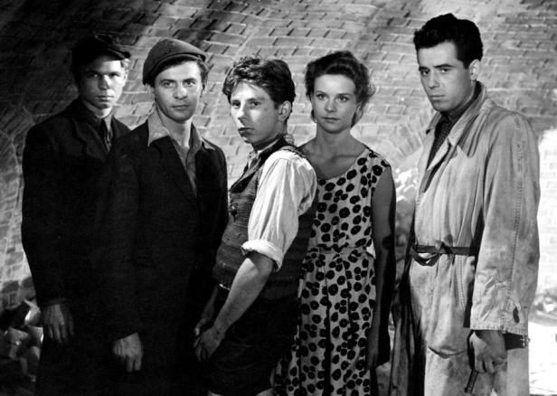 In 1954, Polish cultural policies were still under heavy pressure from Moscow to conform to the strictures of Soviet ‘socialist realism’, Stalin’s dubious ‘gift’ to film aesthetics. Although Stalin was now dead, the strictures were still in place but there was some leeway which Wajda exploited. There are two aspects in which A Generation can be seen as creating a a tension between the ‘official line’ and a more open type of historical drama. The first is aesthetic. ‘Socialist realism’ was never intended to be ‘realist’ as such but instead to represent working man and women as heroic in their struggles on behalf of their communist society. Wajda in the early 1950s was, by contrast’ much taken (like many of his contemporaries worldwide) by the achievements of the Italian neo-realists such as De Sica, Rossellini and Visconti. This is evident in the opening shot of A Generation which comprises a single 4 minute take slowly tracking and panning across a slum area on the western edge of Warsaw. Socialist realism was generally studio-bound and required carefully posed images. Wajda freed the actions of his characters, making excellent use of location shooting wherever possible.