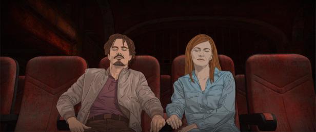 The film project which has taken several years is the product of the imagination of Bánóczki Tibor and Szabó Sarolta. I’m not sure if they are a formal couple but they are both credited as writers, cinematographers, art directors and directors. They also have a veritable army of animators working for them. At 110 minutes, the film is quite long for this form of animation. I haven’t seen work like this for a long time and the last rotoscoped science fiction film I remember is the Phil K. Dick adaptation, A Scanner Darkly by Richard Linklater (US 2006) but I think this new film is less ‘graphic novel-like’. White Plastic Sky felt to me, more detailed. The leads are played by Keresztes Tamás as Stefan and Szamosi Zsófia as Nora.