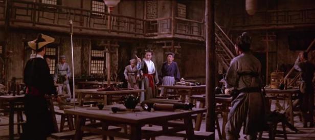 Most of the action takes place in one of four settings, the road through the hills, a roadside inn, the temple where the bandits are hiding and the home of the a mysterious character known locally as ‘Drunken Cat’. These locations are all iconic now since they re-appear in various later wuxia-related films. In particular, the inn is very similar as a location to ‘Dragon Gate Inn’ in Hu’s next film in 1967. Such a location features tables, chairs and benches, staircases to the upper floor, bedrooms, rooftops and beams etc. – a whole panoply of props for a fight.
