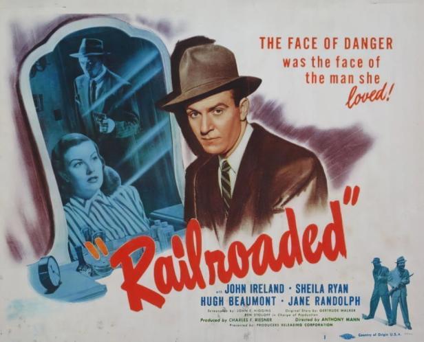 Higgins began work on a story written by Gertrude Walker, but he also drew on the details of a real case of the wrongful arrest of two men, Joseph Majczek and Theodore Marcinkiewicz in early 1930s Chicago. Their convictions for murder were overturned in 1945 for Majczek but not until 1950 for Marcinkiewicz. There were suggestions about incompetence in the prosecution and possible police corruption during Prohibition in Chicago. 20th Century Fox was working on a script connected to these events at around this time. This was Call Northside 777 (1948), directed by Henry Hathaway and starring James Stewart. Fox was so concerned that Railroaded! might eat into the potential audience numbers for their film that they were prepared to pay Eagle-Lion a significant sum to curtail Railroaded!‘s time in cinemas. Eagle-Lion had also to re-shoot some scenes. By this time Mann had already finished shooting his next picture T-Men. If he was disappointed that Railroaded! wasn’t the success it might have been, he was soon going to enjoy his biggest hit so far.