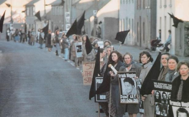 Eventually the Brits trap and capture Frank and Gerard who have killed a squaddie in a gun battle. The pair are put on trial, convicted by a judge (in a ‘Diplock court’ that dispenses with juries) and sent to the new Maze Prison (formerly Long Kesh) where they are locked up in the ‘H-block’. I’m not worried about spoilers here since this is a well-known historical case. Gerard finds himself in a cell with Bobby Sands (John Lynch). IRA prisoners at this time refused to wear prison clothes, maintaining they were prisoners of war, not criminals. The British called them ‘terrorists’. This protest led to the symbol of the blanket which the prisoners wrapped around themselves. The protest then extended to a refusal to shave, have haircuts and then to refuse to ‘slop out’ in a ‘dirty protest’ which saw excrement smeared on the cell walls. The final protest was the Hunger Strike which had been used by earlier generations of Irish prisoners in British colonial prisons. Bobby Sands was elected to the British Parliament when the death of a local MP caused a by-election in Fermanagh and South Tyrone. This proved a powerful statement about the imprisonment of a man elected by his community. Bobby Sands starved to death and in total ten of the prisoners died in 1981 in what was seen as part of the struggle. These are the facts (compressed of course – the blanket protest, dirty protest and hunger strikes had already been used by earlier IRA prisoners). The narrative includes these events but the underlying narrative is about the two single mothers – hence the film’s title.