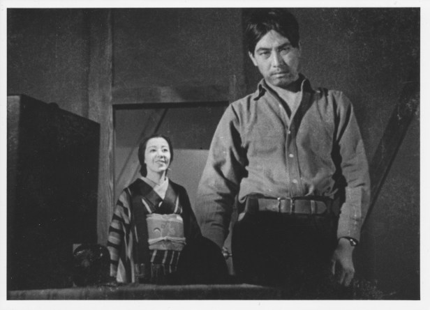 Kenji’s character is established when, ignoring one commandment, he wanders round to the women on the boat and cadges a cigarette. He meets Ohama and also her young daughter Omitsu (Ichimura Mitsuko). He also notices a young woman with an ‘Osaka accent’, Ofuji (Chihaya Akiko); it is clear that she is new to this line of work and is unhappy. Once arrived the men are housed in bunk rooms and start work in the mine. Kenji persuades the Sergeant to accompany him to Ohama’s bar, happily ignoring all the commandments. There he fights off a local soldiers who attacks Chû-kô. Ohama is immediately attracted to Kenji. But he seems as interested in Ofuji. She confides that her mother at home is ill and she wants to send her money and to visit her. Meanwhile it is clear that Ohama takes little notice of her daughter and the Sergeant develops an attraction for Ohama herself. The other women in the bar discuss who will win out in this quartet. We see little of the work in the mine but a cave-in leads to increasing conflicts between the men and at the bar. The ending is downbeat for some but hopeful for others.
