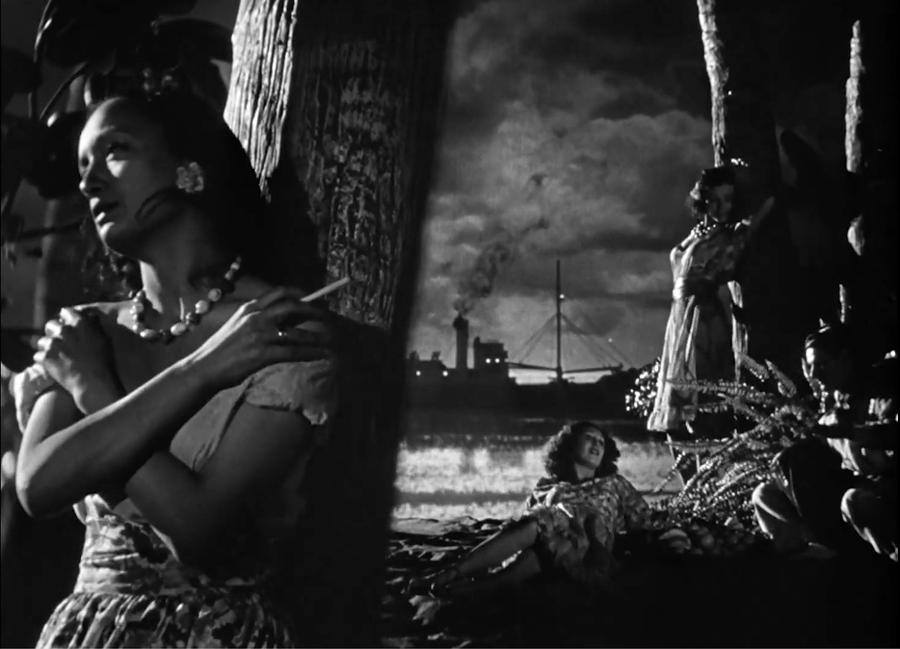 The image above is from the opening sequence of the film when women from the island are ‘allowed’ aboard to entertain the men. Toland shoots from a low angle, something that is quite marked as a feature of his work on Kane. He sometimes organised shots in which he and his assistant were in a pit below floor level. Low angles were relatively unusual on Hollywood sets at this time, especially for interior scenes. Sets did not usually have ceilings and boom microphones would be in sight. For deep focus, muslin could be used as a false ceiling or for exterior shots like this, back projection or a painted backdrop could represent the sky.