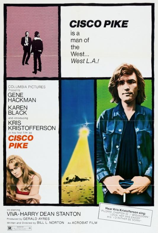 Cisco Pike should have worked. Gene Hackman was top-billed and he was ‘hot’ after the success of The French Connection (1971) for which he would win the Best Actor Oscar and second-billed Karen Black had been in both Easy Rider and Five Easy Pieces (1971), the Bob Rafaelson film which led the more considered arthouse run of counter culture films at this point. Kristofferson was ‘introduced’ by Columbia on this picture and his was certainly the central character in the film. Perhaps it’s worth filling in some details of Kristofferson’s experience at this point. He was both more ‘authentic’ than most of the actors who played counter culture heroes and especially those who played musicians. He was also older. He came from a military family and he excelled at school and college in Southern California, being awarded a Rhodes Scholarship to Oxford. In the UK he continued his college rugby and was awarded a blue for boxing. He had already had essays published in US magazines and he started writing songs, recording some for the UK music impresario Larry Parnes under a pseudonym. In 1960 he joined the US Army and trained as a helicopter pilot based in Germany until 1965 when he turned down a teaching post at West Point and went to Nashville to hawk his songs around the record producers. Several of his songs became country hits for other artists before he made his first album in 1970. Here was a guy who worked as a janitor and flew choppers out to the oil rigs in the Gulf. Kristofferson had a real back story and at 34, despite a lack of formal training he was ready to be a star.
