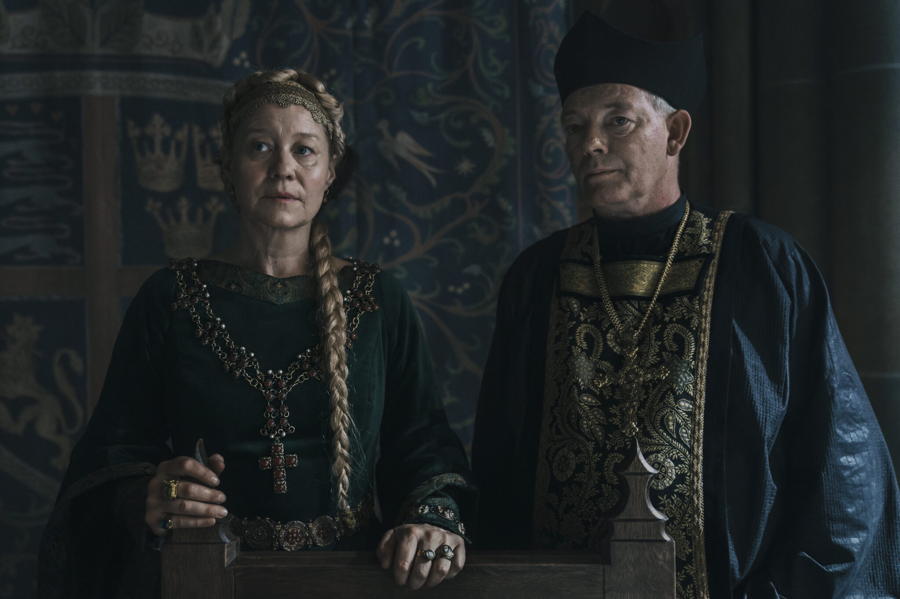 The drama hinges on a classic form of court intrigue. Faced with this possible disruption of all her plans by the ‘man who would be king’, Margrete must act quickly but she is faced with an horrendous decision. If she accepts the return of ‘Olaf’ she will anger one part of the alliance which favours Erik. But if she deems the Olaf claimant as bogus she will offend the Norwegians in particular who recognise him as the real Olaf. At the same time, the English envoy sees this as an opportunity to increase his demands in a renegotiation of the wedding settlement. The film is co-written and directed by Charlotte Sieling who was an actor for many years and then began directing TV series in Denmark in 2000, including episodes of many of the highly successful exports such as The Killing, Borgen and The Bridge. She directed only a couple of features before taking on Margrete, including Above the Street and Below the Water (Denmark 2009) with Sidse Babett Knudsen. In Margrete, the director has Trine Dyrholm as her leading player and Søren Malling as the Bishop, her Chief Minister, who she calls ‘Peder’. Trine Dyrholm is one of our favourite Danish stars and she’s very good in this. Søren Malling is in nearly every Danish film/TV series of note – or so it seems. He has perfected the art of saying nothing and looking blank while carefully considering what to do next. Meddlesome priests are of course de rigueur in European court intrigues and his character doesn’t disappoint here. There is a very large supporting cast with some seemingly familiar faces representing various nobles from each of the three states. The English envoy is played by Paul Blackthorne who I was intrigued to discover first appeared on screen as an English officer in the Hindi film Lagaan in 2001. The only performance that seems to have attracted negative comments is that of Morten Hee Andersen as King Erik, but I think this is a problem associated with the role. Erik is the potentially thwarted adopted son who is only twenty-one and might be expected to behave badly in the circumstances. These kinds of characters seem to be the most difficult to present in historical dramas without such accusations.