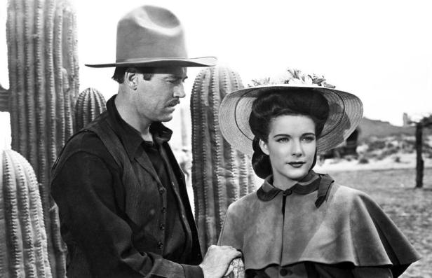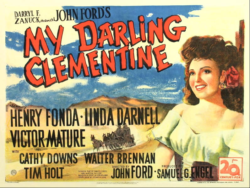 If you haven’t seen the film, the first stumbling block might be the poster which features Linda Darnell above. Much of the studio promotional material feautures Ms Darnell, then a contracted studio player at 20th Century Fox and you might assume that she is ‘Clementine’. But she isn’t, she’s ‘Chihuahua’ the Mexican-Native American young woman attached to Victor Mature’s Doc Holliday. Mature too was a star at Fox and the presence of the pair of Fox stars gives a slightly different feel to a cast otherwise dominated by familiar Ford stock company players. The film narrative is woven into a story based on the myths that developed around Wyatt Earp (Henry Fonda) and his brothers Virgil (Tim Holt) and Morgan (Ward Bond). Ford had met Wyatt Earp in the 1920s when he would appear on the sets of Western films. Earp was friends with stars like Tom Mix and W. S. Hart. Ford might later have claimed that the famous shoot-out at the O.K. Corral, the climax of the film, was shot as Earp later described it but the stories about Earp had already begun to morph into ‘myths’ during his long career as variously a lawman, gambler, fight referee, miner (and, more contentiously, a brothel owner) over more than fifty years as the Western frontier moved and the West was settled. A flattering biography by Stuart N. Lake was published in 1931 (Earp died in 1929) and this became the basis for various later films and TV shows. Ford’s film references Lake’s book but only as a resource, the screenplay by producer Samuel Engel and Winston Miller is based on a story by Sam Hellman.