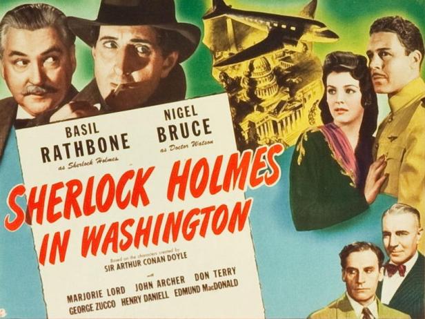 Between 1939 and 1946 a series of fourteen films featuring Sherlock Holmes and Dr. Watson were made in Hollywood. Basil Rathbone as Holmes and Nigel Bruce as Watson were cast throughout. However, there was a big change between the first two films in 1939 and the twelve others. The Hound of the Baskervilles and The Adventures of Sherlock Holmes were produced by Twentieth Century Fox but the studio then decided not to retain the rights and Universal stepped in. The Fox productions were designated as ‘A’ pictures, albeit running at only 81 minutes despite a reasonable production budget and strong casting (Richard Greene a star from British cinema appears in The Hound of the Baskervilles and Ida Lupino in The Adventures of Sherlock Holmes). The Universal productions began in 1942 and were more clearly categorised as ‘B’ films, running only 70 minutes or so with lower production values and less well-known supporting casts. They also updated the Conan Doyle stories and crafted new ones, both being set in the contemporary wartime period of the 1940s. Sherlock Holmes in Washington was the third film in the series.