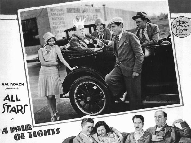 The final film was billed as featuring the ‘female Laurel and Hardy’. There are other claimants to that title as well but Anita Garvin and Marion Byron certainly have links to Laurel and Hardy. A Pair of Tights (1929) is a late silent comedy shot at the Hal Roach studio and featuring production and possibly story by Leo McCarey who would have a very successful career as a writer-director later in the 1930s. The two women don’t adopt the same personae as Stan and Ollie but there is a physical difference between the women that does possibly match Stan and Ollie. Anita Garvin is tall and rather stern/dour compared to the shorter and more ‘bubbly’ Marion Byron. They share rooms together and on this day they have no money and are very hungry. Then Marion remembers that her boyfriend is going to bring his boss over – perhaps they can persuade the boss to take them all out for a meal? But the boss (and the boyfriend) turn out to be ‘tightwads’, spending as little as possible on the women. Nevertheless the women try hard to inveigle the boss into taking them out and he eventually relents. When their car is passing an ice cream parlour Marion persuades him to stop so she can buy four cornets (with his money). But fate will not allow this. Marion will make repeated attempts to carry four cornets back to the car but each time a different calamity will befall her. It’s the only real gag of the film apart from a few familiar pratfalls but it gets better and better as each new calamity is presented and eventually the whole pavement outside the parlour is covered by a throng of people sliding about.