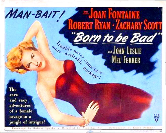 In the end I enjoyed Born to be Bad quite a lot, but I wish I could have seen the alternate ending. There is plenty of writing on the film and it would be fun to study the mise en scène and camerawork in more detail. I’ve come to terms with Joan Fontaine as Christabel but I would like to have seen Gloria Grahame in the role. It would have been a different picture and arguably much more disturbing for the PCA. In the clip below there is a good representation of sexual frisson between Nick and Christabel that presumably did disturb the Breen Office and below that is the original RKO trailer.