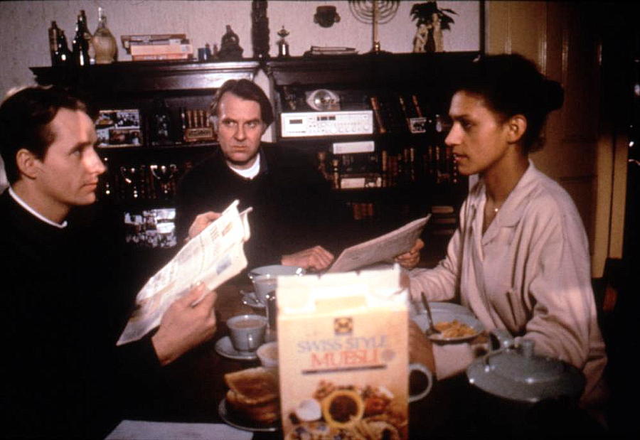 The young priest, Greg Pilkington (Loache) arrives at the presbytery of Father Matthew Thomas (Wilkinson) in a working-class district in Central Liverpool and it is soon apparent that Greg and Matthew are going to prove a combustible pairing. Greg is young but conservative in thinking whereas Matthew has spent several years in Latin America and embodies the thinking of ‘liberation theology’. McGovern is accused by some critics of being too direct in presenting dramatic conflicts. Perhaps he is, the passion is never far away. Here, however, the political allegiances of the two men are summed up by the breakfast view of them with their morning papers – the Guardian for Matthew and the Times for Greg with the topical riposte from Matthew that Greg is accepting the Rupert Murdoch paper into the house. The tension between the two is heightened by Greg’s realisation that Matthew is very close to his housekeeper Maria (Cathy Tyson). The two men deliver sermons to their small loyal flock that are polar opposites in terms of political ideologies but when Greg determines he will go round the district knocking on doors to find his parishioners, Matthew argues against it. The results of the mission confirm Mathew’s wisdom. He is actually deeply embedded in the community.