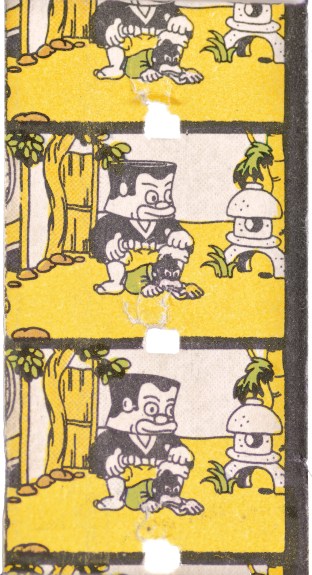 From 1932 to 1938, several Japanese companies produced films on paper rather than celluloid. These films used proprietary epidiascopic projectors for home and neighborhood screenings, capable of screening both opaque and transparent materials. The projectors reflected light off of an opaque film-strip into a lens which then projected the image onto a screen. Individual films were sold in popular department stores, or could be ordered direct via mail catalogue. Films came in lengths of 15, 30, or 45 metres, running about 1-3 minutes, although some films continued across multiple reels. The projectors were hand-cranked, so there was no set projection speed. Films included animé and live-action films (duplicated from celluloid sources), came in black & white and colour, and some films even had original soundtracks supplied on 78 rpm discs that synchronised with the film. The soundtracks featured music, sound effects, and dialogue, or Japanese narrators called benshi.” (Festival Catalogue).